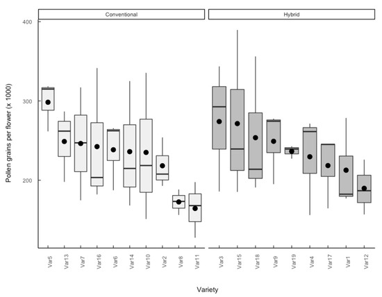 The number of pollen grains per flower in 19 oilseed rape varieties (n = 15 flowers). Black circles represent the mean values. Boxes around the median show the interquartile range. Whiskers extend to minimum and maximum values. Variety names have been anonymised by request.