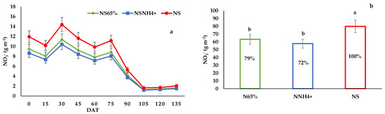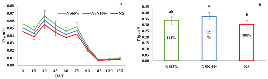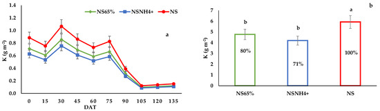 At the beginning of the growing period, leaching of N, P and K was very high for all treatments, and it decreased by the end of the cultivation (Figure 1, Figure 2 and Figure 3). The N, P and K dynamics in leaching in NS65% and NSNH4+ were similar during the whole cycle. The amounts of NO3−, P and K leached were affected by the treatment. The highest NO3− and K leaching was detected in the NS treatment. Leaching in the NS65% and NSNH4+ treatments was 79 and 72% of NO3−, and 80 and 71% of K of the control treatment, respectively. Treatment NS exhibited the lowest P leaching, showing significant differences with respect to NSNH4+.