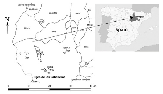 In the rice growing area of Aragon (in Huesca and Zaragoza provinces, northeastern Spain), irrigation water for this crop comes from artificial reservoirs and is stored during winter to be used in the dry summer. After a drought in the winter of 2011–2012, many farmers decided to set aside the plots that year, as they were late for seeding winter crops and did not know until spring if they would have available water. However, some farmers decided to seed forage crops (fescue, ryegrass and lucerne) in March or September. Some farmers returned to rice in 2013 after abundant rainfall and water availability but others continued with the different crops installed during 2012. Rice-cultivated area in Aragon was 13,904 ha in 2011 and decreased to only 6761 ha in 2012 [21]. Taking advantage of this extraordinary situation in an area where normally rice is grown as a monoculture, plots were selected in Zaragoza province with the aid of a local advisor in 2014 (Figure 1).
