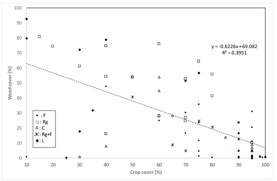 Regression between crop cover (%) and weed cover (%) in the surveyed plots of all crops and in all seasons pooled together.