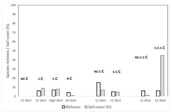In the spring evaluations species richness tended to be higher in the sampled C fields than in other surveys conducted in the area, with a mean of 6.1 species (Figure 3), versus the mean richness of 2.84 in the nearby also irrigated Hoya de Huesca area [22]. Including forage crops such as F or L increased both species richness and weed cover, which is consistent with the findings of Yuan [33].