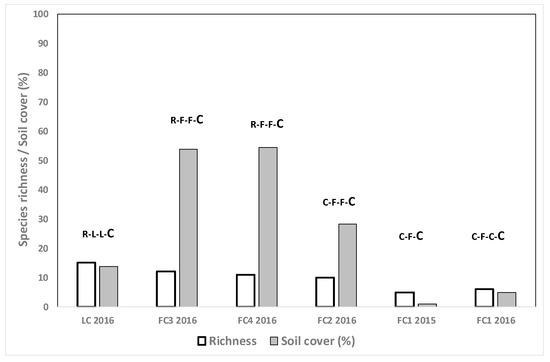 Both species richness and mean weed cover were lower when C was grown after R and NC (Figure 3) compared to growing C after other crops such as F or L (Figure 4). Values of both parameters tended to be higher in the fields where C was grown after two years of F or L (37.6% weed cover, 12.7 richness) than when F was maintained only one year in the crop rotation (3.0% weed cover, 7.0 species richness) (Figure 4).