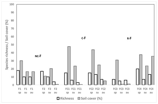 Soil cover in spring was lowest for the newly established L fields and for the recently planted R compared to the rest of the crops (Table 5). In summer, soil cover was again lowest for L, together with Rg, and highest for F and R; in autumn, all crops showed similar soil cover. Concerning the performance of each crop from one season to another, Rg soil cover tended to be higher in spring but lower in summer and autumn, while F, L, and Rg + F maintained more homogeneous soil cover all year round. The mixture of Rg and F tended to cover the soil more than Rg alone and R logically performed better in summer and autumn than when recently sown in spring (Table 5).