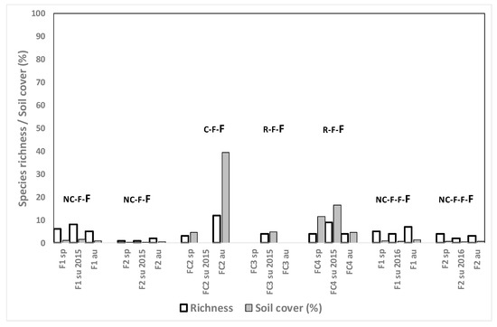 Weed species richness and total weed soil cover (%) for the fescue fields in their second or third year of establishment (F1 and F2 in 2016) in spring (sp), summer (su) and autumn (au) in different crop rotation sequences. Individual species with ≥4% soil cover are listed below. The letters show the crops from 2013 until the sampling moment, the sampled crop being the last of the rotation (in larger letters). R: rice, Nc: no crop, F: fescue.