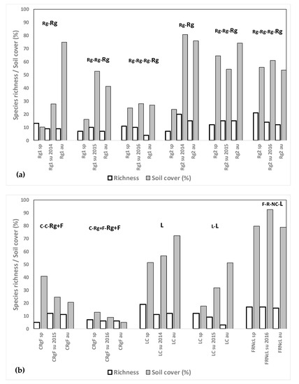 (a) Weed species richness and total weed soil cover (%) for the ryegrass fields after growing rice in spring, summer and autumn 2014, 2015 and 2016 in different crop rotation sequences. The letters show the crops from 2013 until the sampling moment, the sampled crop being the last of the rotation (in larger letters). (b) Weed species richness and total weed soil cover (%) for the fescue+ryegrass and lucerne fields after growing rice in spring, summer and autumn 2014, 2015 and 2016 in different crop rotation sequences. The letters show the crops from 2013 until the sampling moment, the sampled crop being the last of the rotation (in larger letters). C: cereal, R: rice, Rg: ryegrass, F: fescue, Nc: no crop, L: lucerne.