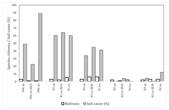 Species richness and total weed soil cover (%) for the fields where rice is grown after other crops in spring, summer and autumn 2014, 2015 and 2016. The sampled crop is the last of the crop rotation.
