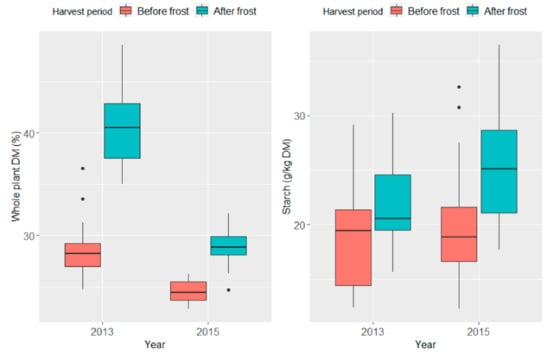 Effect of year and harvest period on DM content and starch concentration of whole-plant corn grown for silage in Lacombe. Each box represents the quartiles, with the median within the box (thick middle line). The vertical lines represent the maximum and minimum values, respectively. Values greater or less than the interquartile range (third–first quartile) ± 1.5 are considered extremes and are represented with dots.