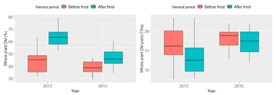 Effect of year and harvest period on DM content and yield of whole-plant corn grown for silage in Lethbridge. Each box represents the quartiles, with the median within the box (thick middle line). The vertical lines represent the maximum and minimum values, respectively. Values greater or less than the interquartile range (third–first quartile) ± 1.5 are considered extremes and are represented with dots.