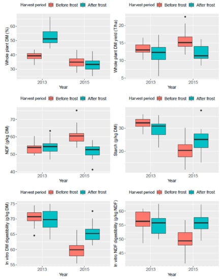 Effect of year and harvest period on DM content, NDF and starch concentrations, in vitro DM and NDF digestibility, and DM yield of whole-plant corn grown for silage in Vauxhall. Each box represents the quartiles, with the median within the box (thick middle line). The vertical lines represent the maximum and minimum values, respectively. Values greater or less than the interquartile range (third–first quartile) ± 1.5 are considered extremes and are represented with dots.