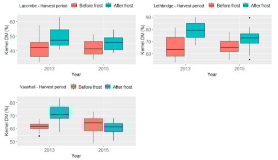 Kernel characteristics were also modified with harvesting time. Being positively correlated with whole-plant DM content, kernel DM content increased after frost at all locations. One may assume that drier kernels would lead to increased kernel hardness, density, and development stage, as well as a higher proportion of small particles. However, with the exception of Lacombe, these correlations were not very prominent and possibly explained by the large differences in kernel DM content across locations, with Lethbridge and Vauxhall presenting contents up to 30% greater than in Lacombe. In other words, kernel characteristics may depend on kernel DM content until a threshold DM level is achieved, above which hardness and particle size become less predictable.