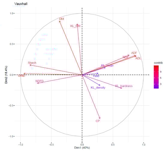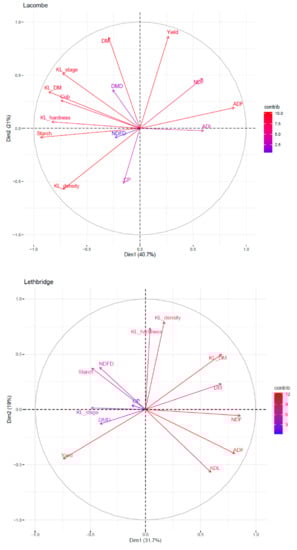 Component pattern plots obtained by principal component analysis, describing the relationship among chemical analyses and kernel properties of whole-plant corn grown for silage for each location (ADF: acid detergent fiber, g/kg DM; ADL: acid detergent lignin, g/kg DM; Cob: dry cob proportion, % DM; contrib: contribution; CP: crude protein, g/kg DM; DM: dry matter, %; DMD: in vitro DM digestibility, g/kg DM; KL_density: kernel density, kg/hL; KL_DM: kernel DM content, %; KL_hardness: kernel hardness, s/20 g; KL_stage: kernel stage; NDF: neutral detergent fiber, g/kg DM; NDFD: NDF digestibility, g/kg NDF; Starch: starch concentration, g/kg DM; Yield: whole-plant DM yield, T/ha). Dim1 and Dim2 are the first two principal components, and they explained 61.7%, 50.7%, and 58.4% of the total variation of the dataset in Lacombe, Lethbridge, and Vauxhall, respectively.