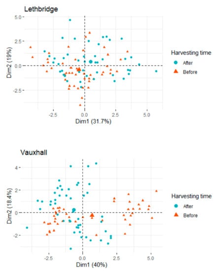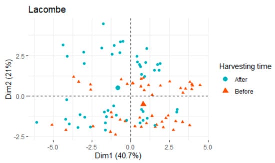 Score plots obtained by principal component analysis, describing the distribution of replicates of whole-plant corn grown for silage according to harvesting time (before or after frost) and location. Dim1 and Dim2 are the first two principal components, and they explained 61.7%, 50.7%, and 58.4% of the total variation of the dataset in Lacombe, Lethbridge, and Vauxhall, respectively.