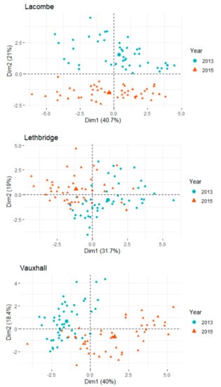 Score plots obtained by principal component analysis, describing the distribution of replicates of whole-plant corn grown for silage according to the year and location. Dim1 and Dim2 are the first two principal components, and they explained 61.7%, 50.7%, and 58.4% of the total variation of the dataset in Lacombe, Lethbridge, and Vauxhall, respectively.