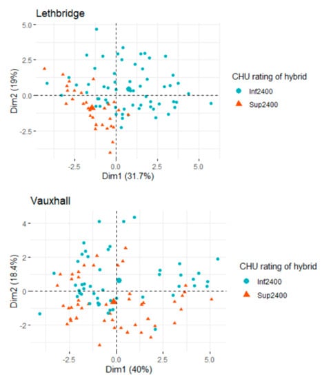 Score plots obtained by principal component analysis, describing the distribution of replicates of whole-plant corn grown for silage according to the CHU rating of the hybrid (inferior or superior to 2400) and location. Lacombe is not represented as the CHU rating of all hybrids was lower than 2400. Dim1 and Dim2 are the first two principal components, and they explained 50.7% and 58.4% of the total variation of the dataset in Lethbridge and Vauxhall, respectively.