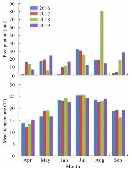 The monthly precipitation was quite variable during the four experimental years (Figure 1). The total precipitation in the growing seasons from 2016 to 2019 was 75.4, 100.9, 158.1, and 105.2 mm, respectively. During anthesis and seed set period (August and September) there was obviously higher precipitation in 2018 (100.0 mm) than that in 2016 (22.3 mm), 2017 (23.2 mm), and 2019 (43.6 mm). The monthly mean temperature showed less variation between four years and followed the typical pattern of temperate continental climate (Figure 1).