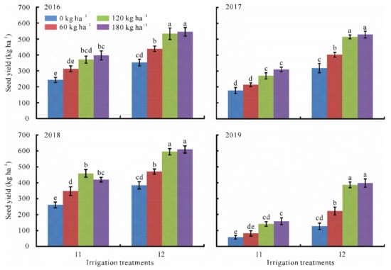 Significant irrigation × N effect was observed, the highest SYs were achieved with the treatment combination of I2 + 120 kg N ha−1 and I2 + 180 kg N ha−1, with the average SY over four years of 507.3 and 520.4 kg ha−1, respectively (Figure 2).