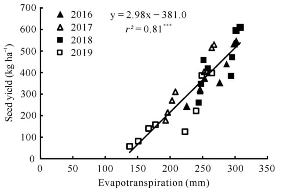 Utilizing the observed results over four-year period, we explored the relationship between ET and SY (Figure 3). The relationship was described by a linear regression (r2 = 0.81; p < 0.001), which indicated a linear increase of SY with a unit increase of ET. The relationship predicated an SY increase of 3.2 kg ha−1 for each millimeter of ET above the threshold value (137.6 mm) required to produce the minimum SY.