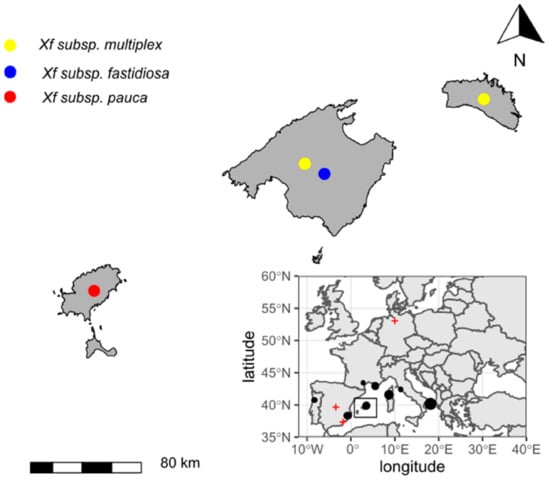 Distribution of Xf in the Balearic Islands and Europe. Outbreaks considered eradicated are marked with a red +. All areas where Xf is well established (black dots) are less than 50 km from the coast. Size of circles is proportional to the area affected by the outbreaks.