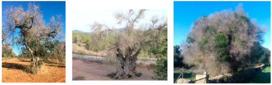 Cultivated olive and wild olive trees infected by different genotypes of X. fastidiosa in Europe. Left, olive tree infected by ST53 subsp. pauca in Apulia, Italy; center, dead olive tree infected by ST80, subsp. pauca in Ibiza, Spain; right, wild olive tree showing severe dieback caused by ST81 subsp. multiplex in Mallorca.