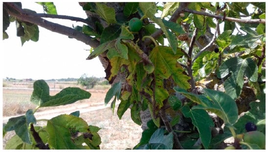 An emergent disease affecting fig trees is caused by the ST81 of subspecies multiplex in Mallorca and Menorca. The etiology of the disease has not been yet studied, but the disease seems quite extended and severe enough to justify more attention. Symptoms begin with marginal leaf necrosis and leaf interveinal chlorosis, progressive tip and shoot dieback, and finally tree death several years after infection (Figure 4).