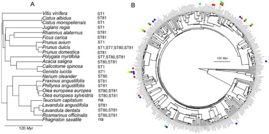 Phylogenetic signal in host range of Xf different STs (clonal lineages) detected in the Balearic Islands between October 2016 and February 2020. (A) Phylogenetic distances of Xf hosts. Each of the ST shares hosts that evolutionarily diverged for > 100Myr (million years). (B) Phylogenetic tree including all plant species (n = 348) analyzed for Xf until February 2020. Blue square, ST1; red square, ST81; green square, ST80; and yellow square, ST7.