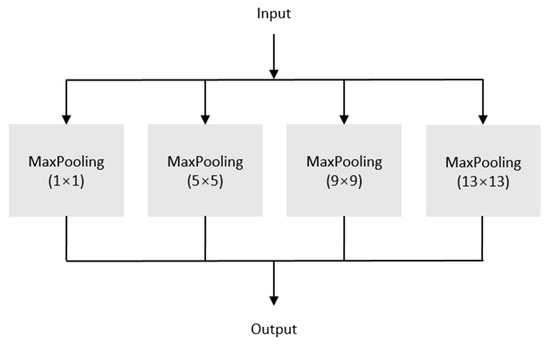 YOLOv4 is the state-of-the-art, real-time detection model, which is further improved based on the YOLOv3 model. As a result, on the MS COCO dataset, without a drop in the frames per second (FPS), the mean Average Precision (mAP) is increased to 44%, and the overall performance is significantly improved. There are three major improvements in the network structure: (1) Using the CSPNet [22] to modify Darknet53 to CSPDarknet53, which further promotes the fusion of low-level information and achieves stronger feature extraction capabilities. As shown in Figure 4b, the original residual module is divided into left and right parts. The right parts maintain the original residual stack, and the left parts use a large residual edge to fuse the low-level information with the high-level information extracted from the residual block; (2) Using the Spatial Pyramid Pooling (SPP) [23] to add 4 different max-pooling operations at the last output to further extract and fuse features, the convolution kernel size is (1 × 1), (5 × 5), (9 × 9), and (13 × 13), as shown in Figure 5; (3) Modifying Feature Pyramid Networks (FPN) [24] structure to Path Aggregation Network (PANet) [25], that is, add a top-down structure to the bottom-up structure of FPN to further extract and merge feature information, as shown in Figure 6b.