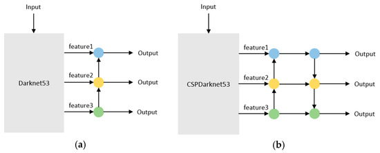 Comparison between Darknet53 and CSPDarknet53. (a) Darknet53, (b) CSPDarknet53.