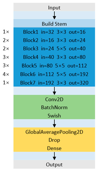 where the d, w, and r are the coefficients used to scale the depth, width, and resolution of the network. The α, β, and γ are resource allocation for network depth, width, and resolution. According to the research of Tan M [19] in his paper, the network parameters of EfficientNet-B0 are shown in Table 2. The optimal coefficients of the network are: α = 1.2, β = 1.1, γ = 1.15. EfficientNet is mainly made up of Stem, 16 Blocks, Conv2D, GlobalAveragePooling2D, and Dense layers. The design of Blocks is mainly based on the residual structure and attention mechanism, and the other structures are similar to conventional convolutional neural networks. Figure 7 shows the EfficientNet-B0, which is the baseline network of EfficientNet.