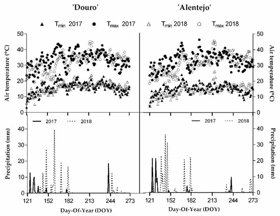 The regions are characterised by a warm-temperate climate with dry and hot summers [], and rainfall concentrated during the winter months. Based on the Multicriteria Climatic Classification System (MCC System), three bioclimatic indices were chosen []: (i) the Huglin Heliothermal Index (HI), which includes mean and maximum temperatures and a day-length factor for a proxy for radiation; (ii) the Cool Night Index (CI), a strictly thermal index, which accounts for mean minimum temperature during maturation (September in the northern hemisphere); (iii) and the Dryness Index (DI), consisting of an adaptation of the potential soil water balance. Regarding thermal conditions, the HI indicated a very warm viticultural climate structure during the experiments (Table 1), excepting the 2018 growing season in Alentejo, which was classified as warm. Complementary to HI and thermal regime, the CI indicated that night temperature conditions in both regions were mostly considered as temperate. Related to the level of potential soil water availability, the DI was mostly rated as very dry in both regions under study. An automatic weather station was set up in each trial site, recording standard meteorological variables, such as the minimum and maximum air temperatures, and precipitation (Figure 1). The occurrence of heatwave events was also assessed by sorting at least five consecutive days with maximum air temperature above 40 °C []. In the Douro experiment, two heatwaves were recorded in 2017 (DOY 165–169 and DOY 193–198), and one in 2018 (DOY 213–218). Similarly, two heatwave events were also recorded at the Alentejo site in 2017 (DOY 167–171 and DOY 192–197), and one in the 2018 growing season (DOY 213–218). In 2017, total precipitation at the Douro and Alentejo regions during the experiments was 65.0 and 31.6 mm, respectively, whereas in 2018, total precipitation of 173.8 and 80.4 mm was recorded in the Douro and Alentejo sites, respectively.