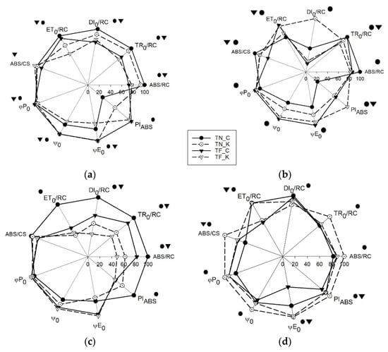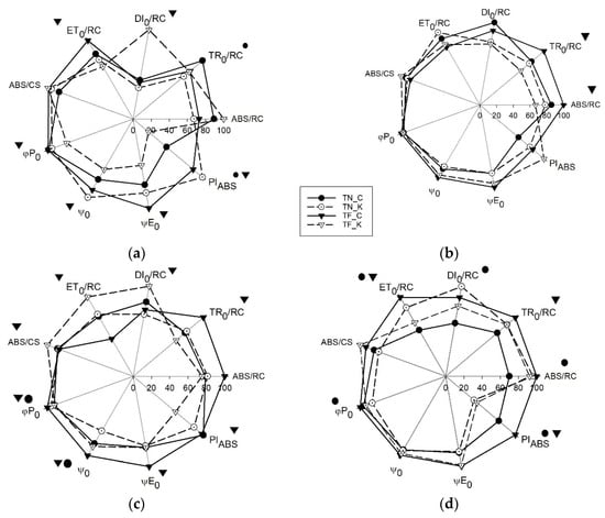 Radar plots of JIP parameters deduced from chlorophyll a fluorescence OJIP transients in the grapevine leaves of Touriga Nacional control (TN_C) and kaolin (TN_C), and Touriga Franca control (TF_C) and kaolin (TF_K) in the Douro site at stages EL35 and EL38 of 2017 (a,b) and 2018 (c,d). Data are mean ± SD (n = 18). For each parameter, the lower value represents relative change against the maximum value, set as 100%. Closed circles (⬤) and triangles (⯆) at the top of each parameter represent significant differences between treatments in Touriga Nacional and Touriga Franca, respectively.