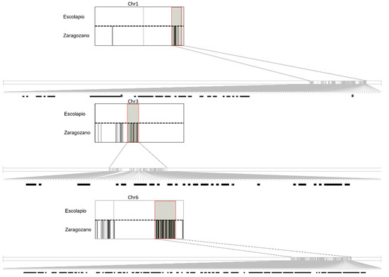 Representation of genotype differences found in chromosomes 1, 3, and 6 between ‘Escolapio’ and ‘Zaragozano’ accessions represented by Flapjack software [43]. The rectangle represents whole chromosomes of both accessions, separated by dotted lines. A black line means that a different genotype was observed between both accessions, while white means the same genotype. Regions with high genotype differences were zoomed in and highlighted by a red rectangle.