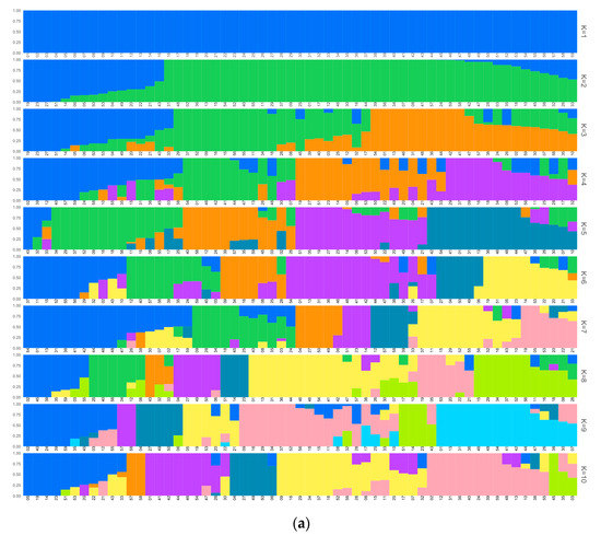 - Raj, A.; Stephens, M.; Pritchard, J.K. FastSTRUCTURE: Variational Inference of Population Structure in Large SNP Data Sets. Genetics 2014, 197, 573–589. [Google Scholar] [CrossRef] [PubMed]