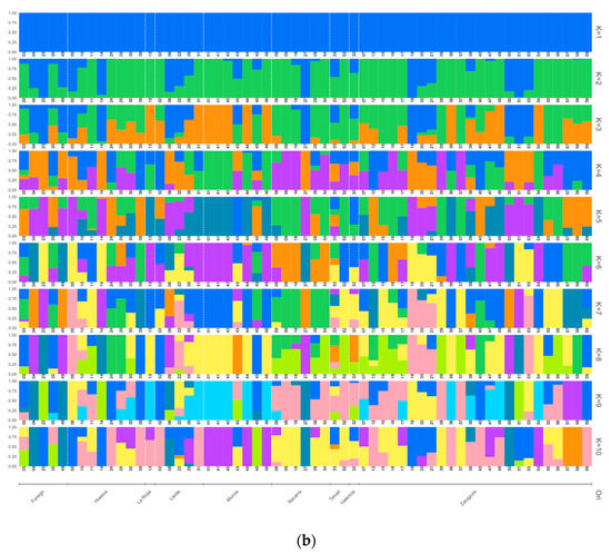 Structure results for k = 1 to k = 10 of the accessions excluding the duplicates: (a) placed according to cluster order; (b) placed according to geographic origin. The ID numbers can be found in Supplementary Table S1A.