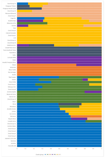 Following the criteria of assigning an individual to the cluster of its maximum estimated membership coefficient value, the size of the cluster ranged from 3 to 18 individuals (Figure 4). Cluster 1 was the largest one (18 individuals) and was composed of ‘Maruja’ (clone group 4 and 6), ‘Jerónimo’ (except ‘Jerónimo Espuña’) (clone group 4), and ‘Calabacero’ (clone group 1) accessions from the Murcia region and another 13 accessions from the north of Spain. Among these accessions from the north, the group formed by ‘Duraznillo 42B’, ‘Generoso’, ‘Sudanell 1’ (2211 AD), Miraflores accessions (clone group 3), and the clonal group 11 (formed by Sudanell cultivars and ‘La Escola’ (5340)) showed a high membership coefficient (0.999). Cluster 2 was composed of some northern Spanish accessions, mainly from Navarra, ‘Jerónimo Espuña’ from Murcia, and ‘Andora’ and ‘Vivian’ (5266) from USA. Cluster 3 was composed of two foreign nectarine accessions (‘Aniversario’ from Argentina and ‘Aurelio’ from USA) and three peach accessions from the north of Spain (‘Blanco Tardío’, ‘Rojo de Azagra’, and ‘Buisan’). All the accessions within cluster 3 had melting flesh, except for ‘Rojo de Azagra’. Cluster 4 was made up of ‘Pepita’ from Brazil, ‘Amarillo Temprano (Ebro)’ from Zaragoza, and ‘La Escola’ (5093) from Lleida. Cluster 5 was composed of three accessions from Zaragoza (‘Gallur’, ‘Pavía Amarilla de Tolosa’, and ‘Pavía Blanca’), one accession from Navarra (‘Campiel M. de Cierzo’), and one accession from Teruel (‘Valdeltormo B.D.’), although this last accession showed a similar membership coefficient with another three different clusters (clusters 4, 6, and 7). Cluster 6 was mainly formed by accessions from the north of Spain, although the accessions ‘Utiel BD’ from Valencia and ‘Brasileño Elipe’ from Murcia showed a considerable membership coefficient with this cluster (0.652 and 0.542, respectively). All of the flat peaches in the study, accompanied by ‘Montaced (Binaced)’ and the clonal group 15 (‘Borracho de Jarque’, ‘Comodin’, and ‘Moret’), formed cluster 7.