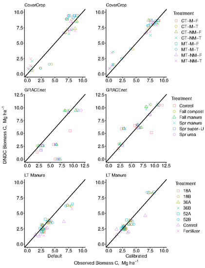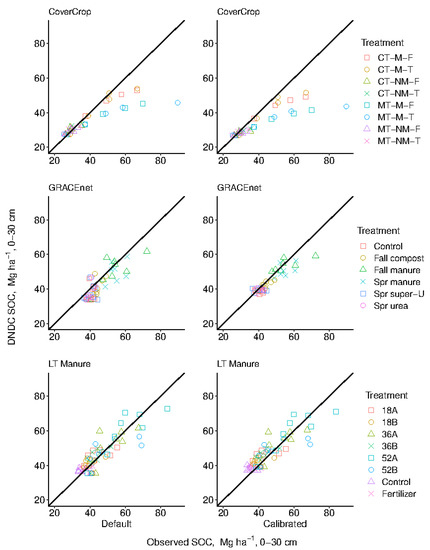 This result is also demonstrative of the utility of pairing empirical data with modeled output, even though adequate simulation of SOC by DNDC is typically reported [79,80]. Overall, our results indicate DNDC simulated SOC values adequately over the duration of our research studies in a default capacity considering the diverse management practices simulated, although calibration can improve model performance.