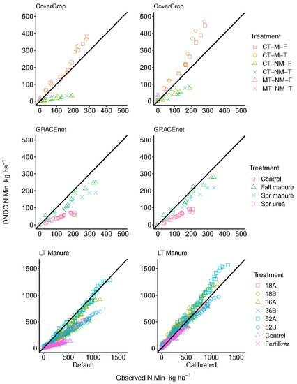 This was especially evident at the LT manure location as goodness of fit statistics improved with increasing application rates and were more favorable under annual as opposed to biennial applications (Figure 3, Table S3 and Figure S30). In response, decomposition rates were increased for the litter and humus pools under the calibration at all locations. The modeled N mineralization at the LT manure location was improved from the default scenario, PBIAS from –30.9% to 6.2%, NSE from 0.70 to 0.92, and MAE from 121 kg ha–1 to 59 kg ha–1 (Table 4 and Figure S31). Although decomposition rates were increased by the same margin at the GRACEnet location, fit was only modestly improved. At CoverCrop, overall goodness of fit indicators declined after calibration as only CT-NM-F and CT-NM-T treatments were improved (Table 4, Table S3). However, the quantity of comparable data was low at this location (Figures S10 and S11). Similar evaluations of the DNDC model have reported underestimation of N mineralization when contrasting various soil N pools [82,83], more so where N inputs were low [84,85]. Smith et al. [82] recommended revision of the mineralization module within DNDC if improvements to the hydraulic simulation could be completed beforehand. Krobel et al. [83] suggested that while increasing the decomposition rates would ameliorate underprediction of soil N pools, it may be detrimental to the soil C budget. In our calibration, decomposition rates were increased without degrading SOC simulation in 2 of 3 locations; although, changes to cropping parameters were required (Table 4).