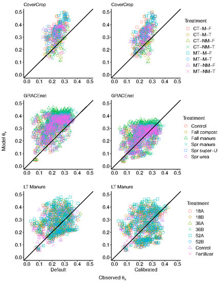 Denitrification decomposition (DNDC) model prediction of soil water contents, 0–15 cm, in a Default and Calibrated capacity relative to observed values. The diagonal line indicates a slope of 1.