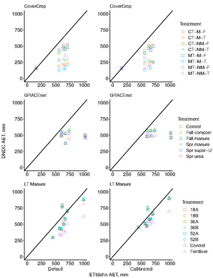 Observed values of volumetric soil water content were obtained by time domain reflectometry (GRACEnet and LT Manure) or neutron probe (CoverCrop) at a depth of 0–15 cm. Soil water content data were available for all seasons and treatments at GRACEnet and CoverCrop. At LT manure 2013 to 2017 records were available excluding 18B, 36A, and 52B treatments which had records for 2015 to 2017. Lastly, AET estimates from ETIdaho, a multi-crop ET estimator for Idaho, were compared with DNDC AET estimates between planting and harvest dates for model calibration [32,33]. When a perennial was grown year-round, the annual AET was used. Although the ETIdaho estimated AET is most similar to DNDC estimated AET (by accounting for crop stresses and more complex shallow soil water dynamics), the ETIdaho database was last updated in 2016 which limited comparisons. As a result, where ETIdaho data were lacking, a more generalized crop specific AET estimate (Agrimet) was compared with DNDC AET. Calibration was performed solely on ETIdaho estimates; however, figures and statistics were updated to include the Agrimet data (2017 to 2019) to enhance comparison. Generally, the Agrimet AET estimates are slightly larger than ETIdaho estimates, however trends in water use are similar.
