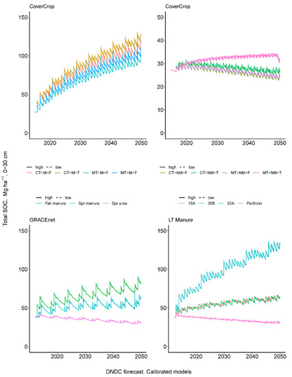 The calibrated models were used to forecast SOC levels under a subset of treatments up until year 2050. All treatments were forecasted at CoverCrop; at GRACEnet, Spr urea, Fall and Spr manure were forecasted; at LT manure 18A, 36B, 52A and Fertilizer treatments were forecasted. Model event schedules were modified in order to loop cropping rotations for the length of the forecasted scenario. For CoverCrop, the continuous corn cropping system permitted all events (2015–2019) to be looped. For GRACEnet, the first complete rotation of corn-barley-alfalfa-alfalfa-alfalfa (2013–2017) was looped. For LT Manure, two cycles of the wheat–potato–barley–sugarbeet rotation (2013–2020) was looped after repeating the 2016 sugarbeet year in 2020. Climate files used for each respective looping period were also repeated to reduce variability in the forecasted scenario. Precipitation in climate files was modified to reflect a projected 7.5% increase in regional precipitation by 2050 [36]. Similarly, temperature was modified according to “high” or “low” emissions projections resulting in 2.64 and 1.94 °C higher temperatures on average by 2050 and output for both the “high” and “low” emissions future climate scenarios are reported. Atmospheric CO2 was held constant during the scenario as the default value of 350 ppmv was not altered during the “default” and calibrated scenarios.