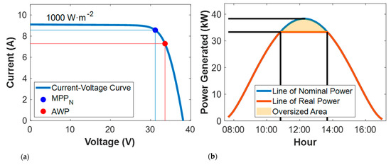 (a) Current-Voltage curve and nominal and real points of maximum power (MPPN and AWP of operation and (b) example of power generated by the photovoltaic generator. MPPN: nominal point of maximum power operation. AWP: actual working point.