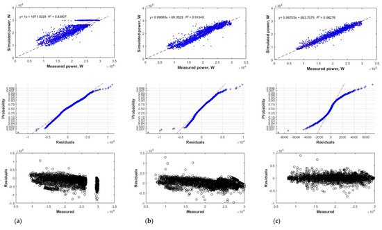 A comparison between the power values measured with the electrical network analyser at output VFD (in AC) and the evaluated models is shown in Figure 3: (1) simplified model, (2) I-Solar model, and (3) AI-Solar model. The statistical analysis is shown in Table 6. The developed AI-Solar model was trained with GPR-Exponential (GPR-E), which results in greater precision.