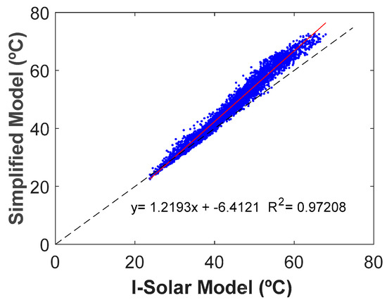 where Tc is the cell temperature (°C), Tm is the photovoltaic module temperature (°C), E is the incident solar irradiance on the photovoltaic module surface (W·m−2), Eo is the reference solar irradiance in the photovoltaic module (1000 W·m−2), and ΔT is the temperature difference between the cell and the back surface of the photovoltaic module.