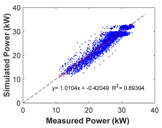 The most accurate machine learning type was a Gaussian process regression (GPR) with exponential kernel function, with a relative error of 5.8%, a RMSE of 1226.7 W, and an R2 of 0.95. The poor performance of the linear regression models shows the complexity and non-linearity of the analyzed problem. The same result is observed when using a linear kernel in the SVM algorithms. However, the remaining algorithms that use non-linear kernels show adequate performance.