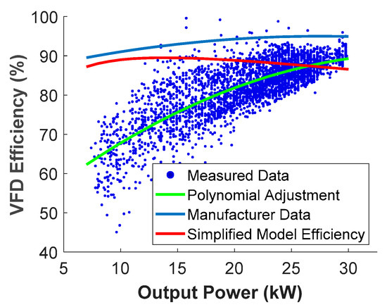 In the simplified model, to calculate the VFD efficiency (ηVFDSimplified), the polynomial of the VFD efficiency function of the inlet power is used (Equation (17)).