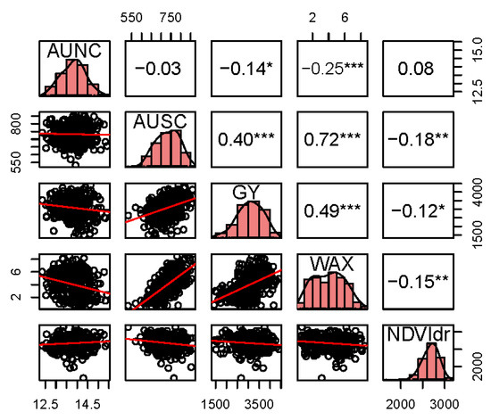 Correlation analysis was performed for each trait using trait means calculated using the data from all four field experiments. The results showed a significant positive association between grain yield (p ≤ 0.0001) and AUSC (r = 0.40), and grain yield and waxiness (r = 0.49) (Figure 1). However, a significant negative association (p ≤ 0.05) was observed between grain yield and AUNC, and waxiness and AUNC, which was unexpected. Similarly, NDVIdr showed a significant negative association with AUSC (p ≤ 0.001), grain yield (p ≤ 0.05), and waxiness (p ≤ 0.001), which was also not expected.