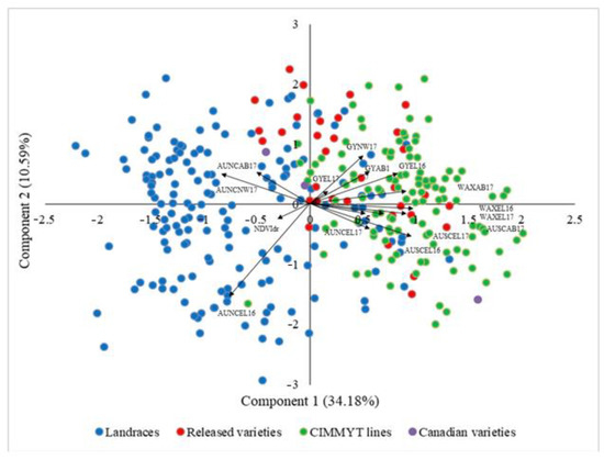Principal component analysis (PCA) was performed using the data on chlorophyll-related traits, waxiness, and grain yield recorded for all field experiments to assess the association among these traits. It was found that the first two principal components accounted for 44.73% of the variation (Figure 2). The bi-plot generated using these first two principal components showed that component 1, which explained 34.18% of the variation, was positively associated with grain yield, AUSC, and waxiness. In contrast to this, AUNC (except AUNC for Elora 2017) was negatively correlated with component 1. This result supports the results from correlation analysis related to the unexpected negative association of AUNC with grain yield and waxiness, and the negative association of NDVIdr with grain yield, AUSC, and waxiness. The bi-plot also shows that there was little overlap of landraces and the modern varieties/advanced lines with the CIMMYT lines: the released cultivars were more associated with high grain yield, while the majority of the landraces occupied space in the lower yielding area of the biplot (Figure 2).