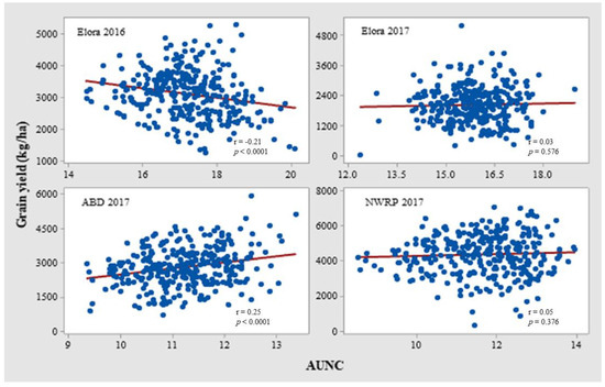 In the case of the data obtained from the ABD (Nepal) site, a significant positive association of AUNC with grain yield was observed, but again, the correlation between AUNC and waxiness was negative. For the NWRP (Nepal) site, grain yield did not show any association with AUNC (Table 1); specifically, the association of AUNC with grain yield (Figure 3), and the association of waxiness with AUNC and AUSC (Figure 4), indicated the need for further analysis.