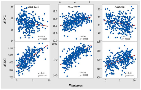In addition, a positive association between waxiness and AUSC was consistently observed both for the combined analysis or when the data were analyzed by site or stratified by waxiness scores or breeding history (Table 1, Table 2 and Table 3). Grain yield was found to positively correlate with AUSC in three of the four test environments.