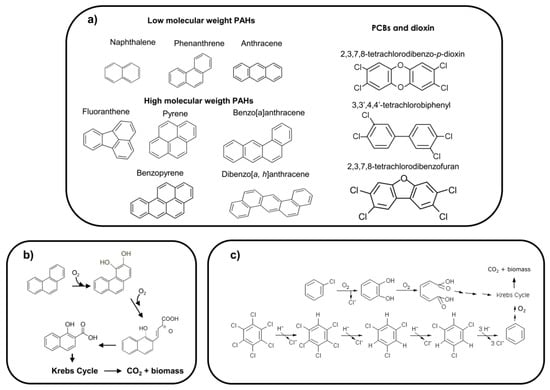 Biodegradation of BTEX, PAHs and, to lesser extent, PCBs is performed by a large number of different microorganisms, including bacteria, fungi and algae that have been isolated from very diverse edaphic and aquatic, aerobic and anaerobic environments, and many reviews have been published on the subject since the 1980s [,,,]. Among BTEX- and PAH-degrading bacteria, Pseudomonas, Sphingomonas, Burkholderia, Mycobacterium, Rhodococcus and Bacillus have been extensively studied. Stenotrophomonas and Pasteurella species, and some anoxic PAH-degrading bacteria belonging to the Delta-proteobacteria, have also been reported. Aerobic bacterial biodegradation of these compounds requires the presence of O2 to initiate the enzymatic attack on the aromatic rings of PAHs [,]. In the initial step, dioxygenase catalyses the oxidation of an aromatic ring to yield non-aromatic cis-dihydrodiols. These initial dioxygenases are multi-component enzyme systems that catalyse the dihydroxylation of PAHs ranging in size from two to five fused rings. These dihydroxylated intermediates are then, upon enzymatic rearomatization to diols, cleaved by monocomponent intradiol or extradiol ring-cleaving dioxygenases (through either an ortho-cleavage pathway or a meta-cleavage pathway). Further breakdown then leads to central intermediates such as cis,cis-muconic acids or hydroxymuconic semi-aldehydes in the case of the degradation of monoaromatic rings, or to salicylates, catechol-like structures or protocatechuates in the degradation of higher annelated aromatics. All these intermediates are then further converted to tricarboxylic acid (TCA) cycle intermediates, used for anabolic biomass formation and mineralized to CO2 (Figure 1b) [,]. Compounds such as naphthalene (two aromatic rings), anthracene or phenanthrene (three aromatic rings) can be completely mineralized by many of these bacteria; however, the mineralization of HMW-PAHs has not completely been elucidated, and in some bacteria, only partially degraded, dead-end products have been detected [].