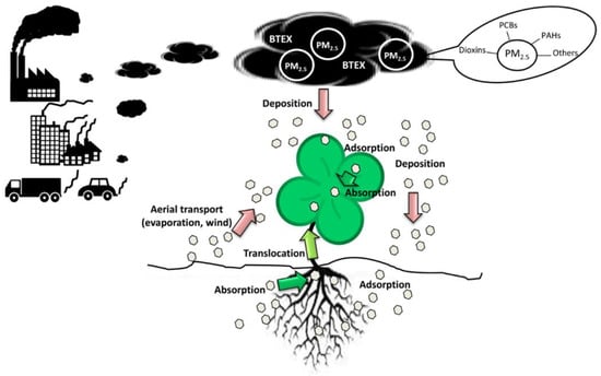 Atmospheric contaminants can be deposited directly from the air onto leaves or can be deposited in soils, and are then adsorbed to roots []; they can also be mobilized from soil to leaves by evaporation or wind, or be transported from roots to leaves (Figure 2) [,,]. The direct relationship between PAH concentrations in soil and in plants suggests that soil-to-root transfer dominates over atmosphere-to-plant transfer []. Relatively volatile organic compounds, such as BTEX, anthracene and phenanthrene, are more likely to be deposited on the leaf cuticle through gaseous depositions whilst less volatile compounds, such as benzo[a]pyrene, are deposited by particulate depositions [].
